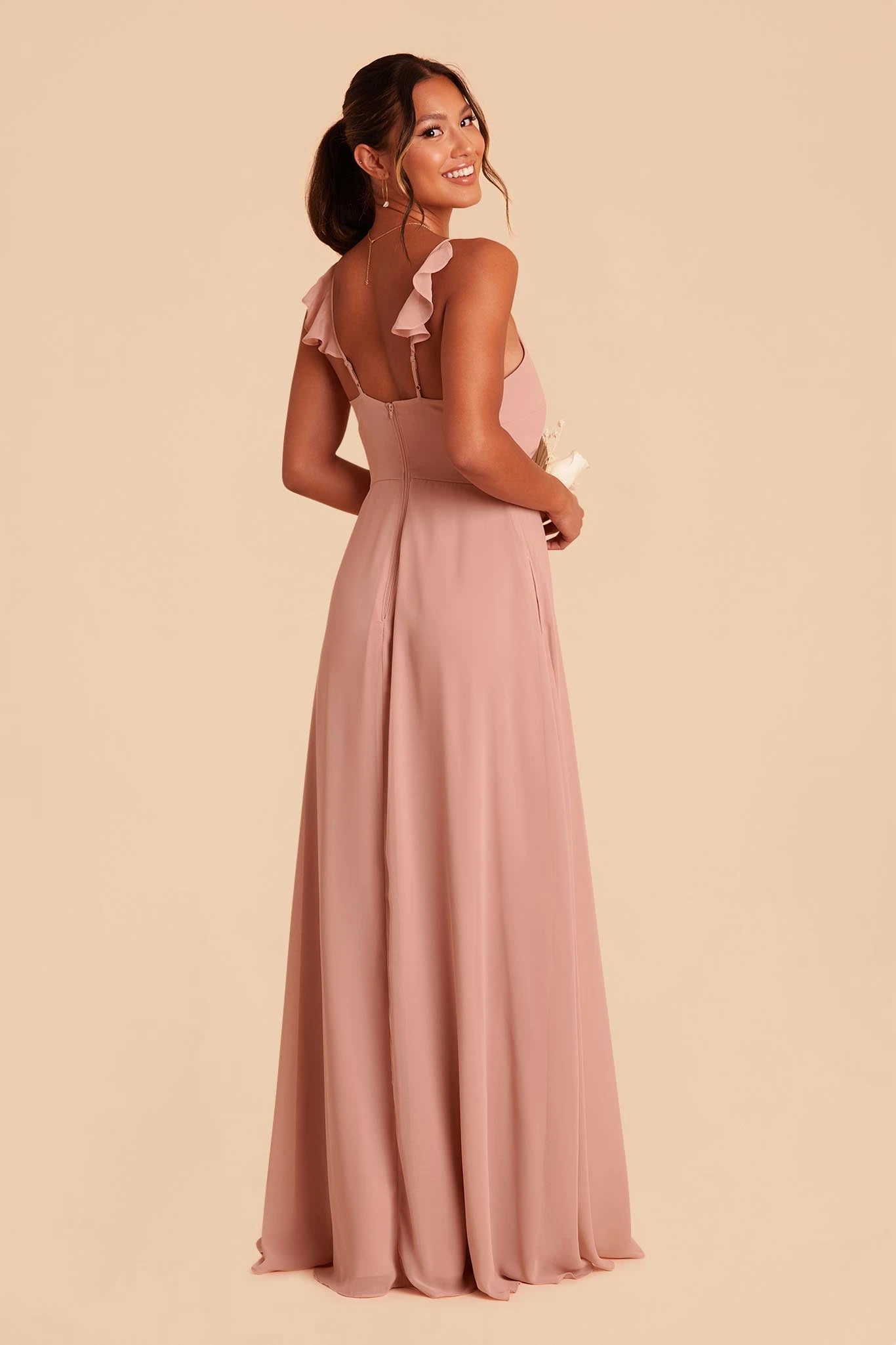 For a business-in-the-front, sweetness-in-the-back kind of look, we’re in love with the modern minimalism brought by this understated v-neckline and ultra-flattering fitted bodice. Give her a spin and everyone will fall for the airy chiffon number with a surprise flutter detail on the back of Adelle’s thin straps, bringing the perfect dose of flair and romance. For the bridesmaids who are equal parts feminine and minimal, this gown is just right.