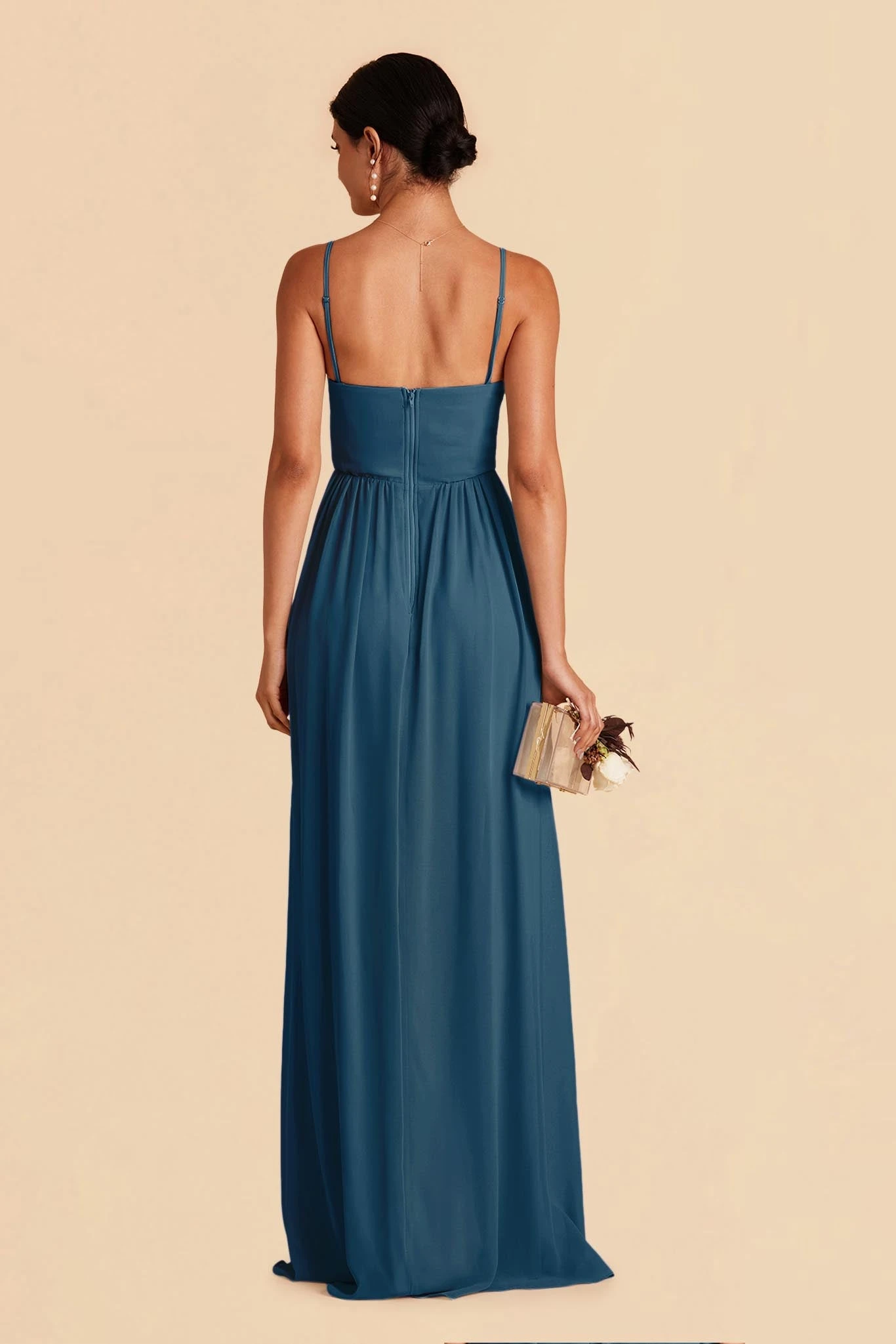 Less is absolutely more with this ultra-simple convertible dress. August features a straight neckline with removable straps. The bodice has boning for added structure and support. You can keep the straps on, remove it completely, or attach draped sleeves for an off-the-shoulder look.