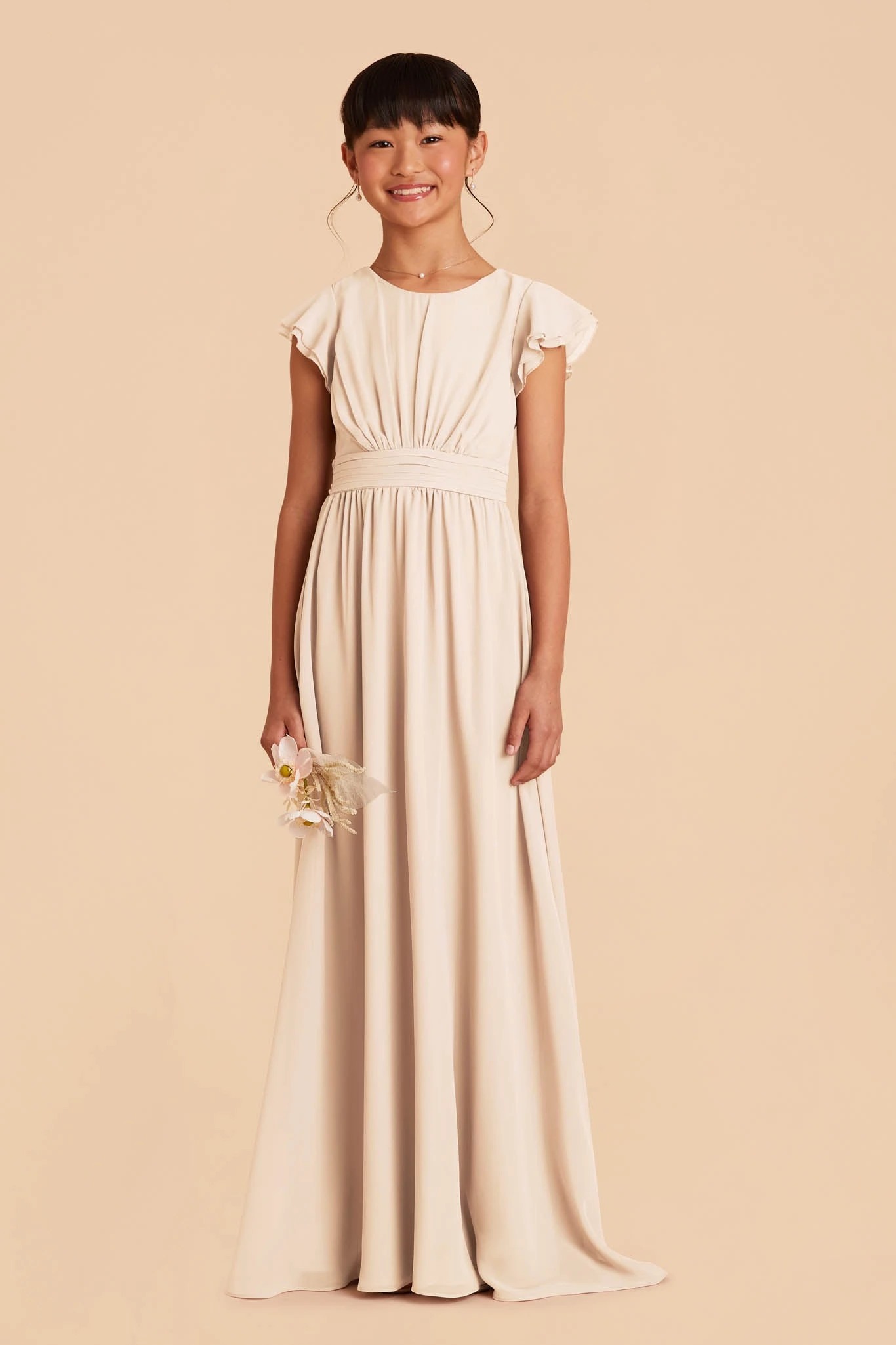 This sweet ruffle-sleeved dress is a dream for a junior bridesmaid. This design features a waistband tie in back for juniors who are between sizes.