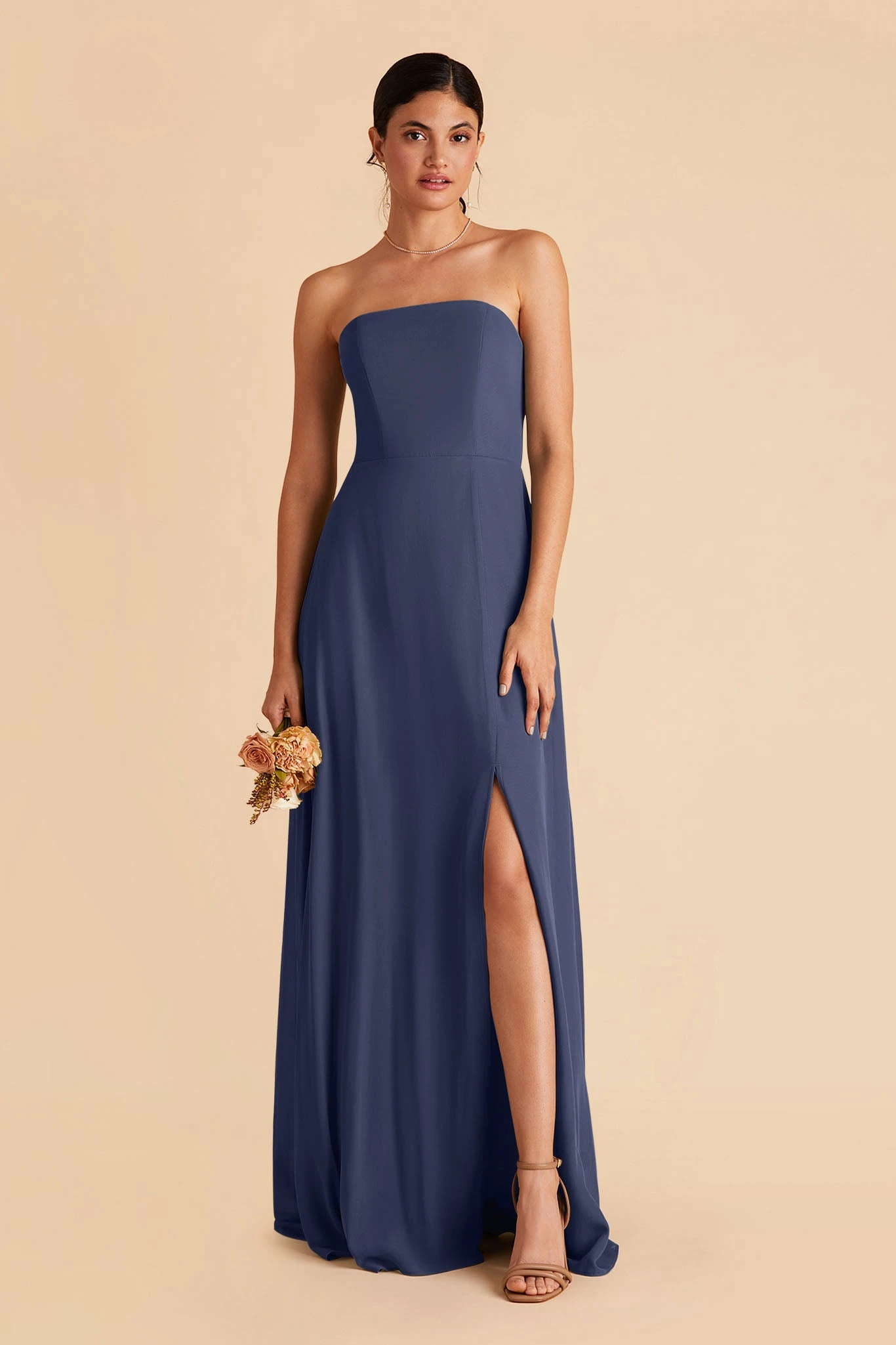 It doesn’t get any simpler than this! Our Chris convertible dress is a straight-neck gown that can be worn with spaghetti straps or with no straps at all. It features a more fitted top, with boning sewn in, for added support when wearing without the straps. Pair this ultra-low-key gown with a statement necklace or dangly earrings.
