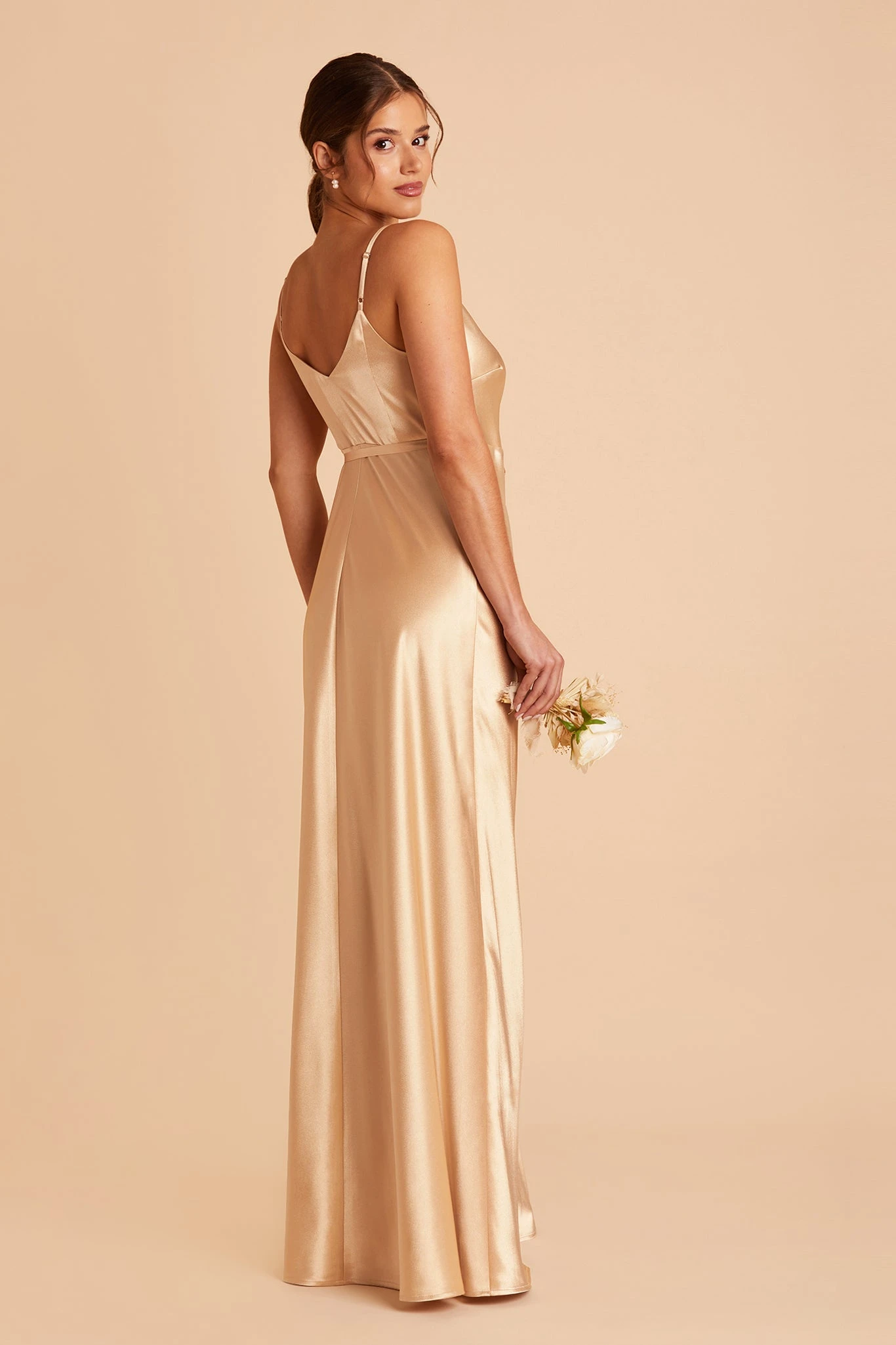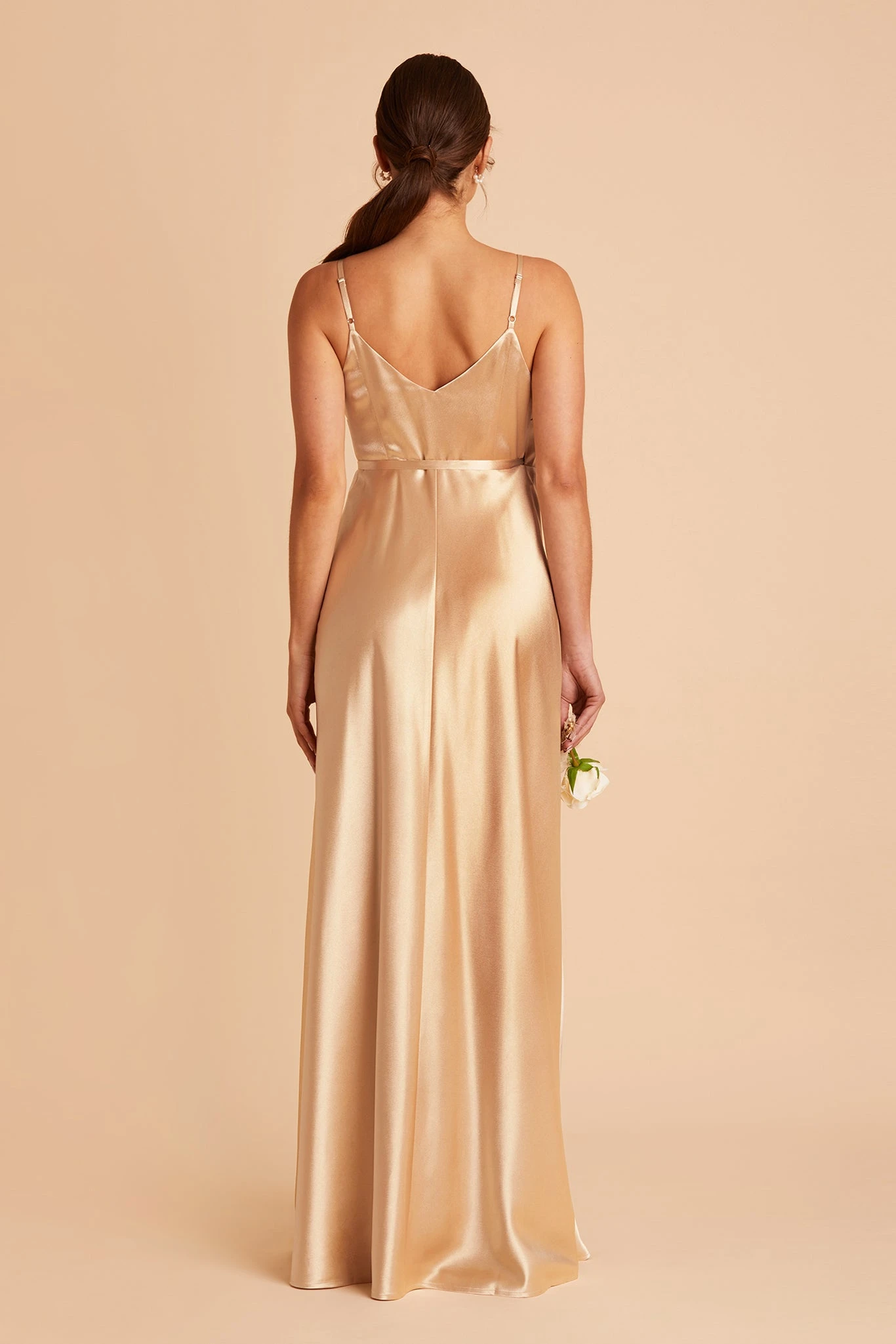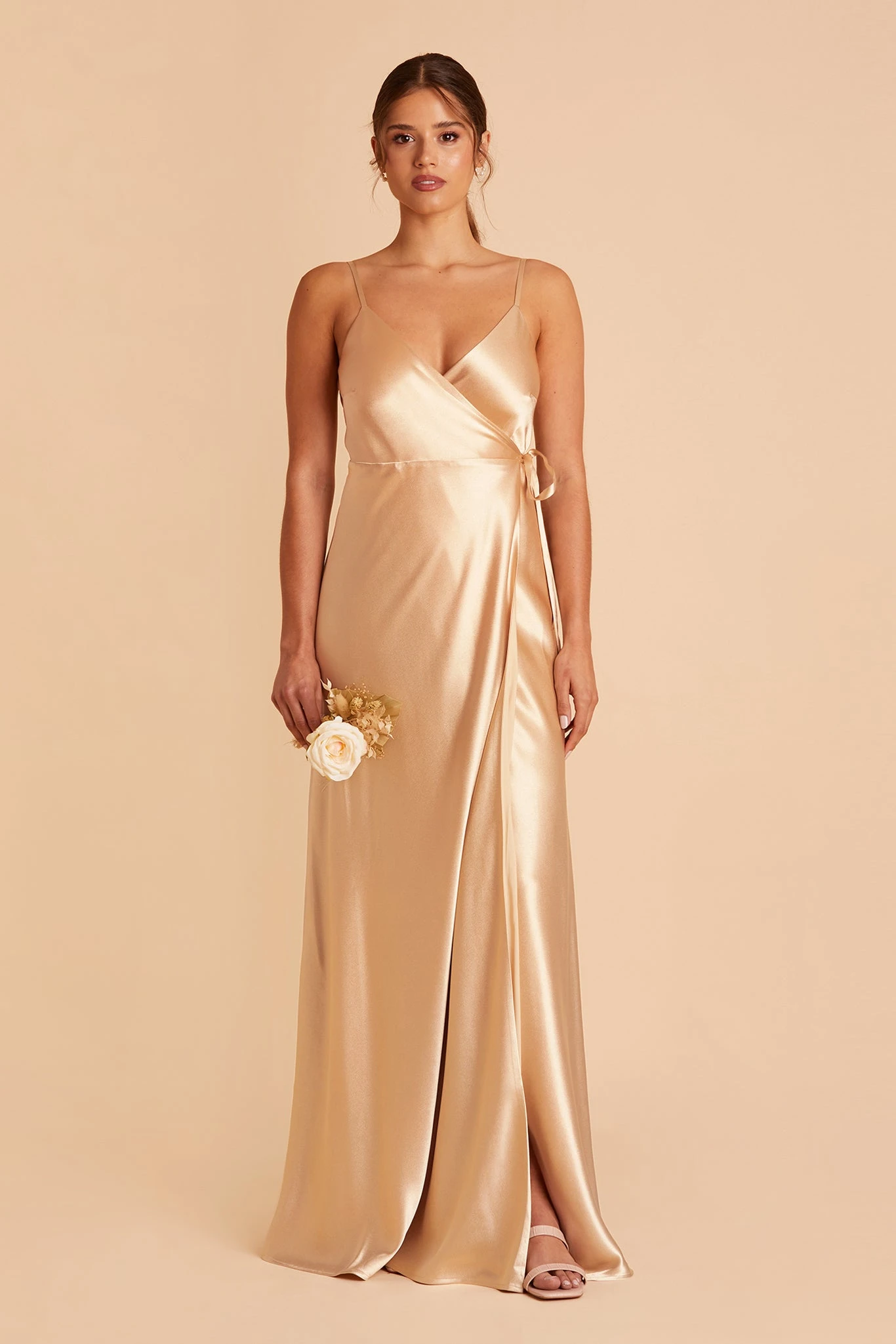 This satin wrap dress is an absolute stunner. Any bridesmaid will love how our Cindy dress flatters, emphasizing her natural waistline and elongating her frame. Perfect for a formal affair, our shimmering satin amps up the glam. The sky’s the limit when it comes to accessorizing Cindy. She pairs beautifully with dangly earrings or a dramatic statement necklace.