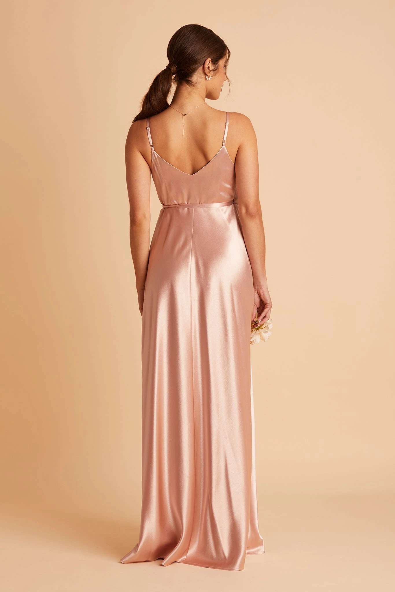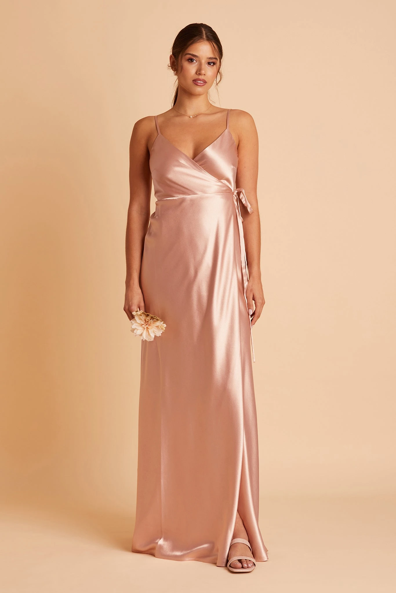 This satin wrap dress is an absolute stunner. Any bridesmaid will love how our Cindy dress flatters, emphasizing her natural waistline and elongating her frame. Perfect for a formal affair, our shimmering satin amps up the glam. The sky’s the limit when it comes to accessorizing Cindy. She pairs beautifully with dangly earrings or a dramatic statement necklace.