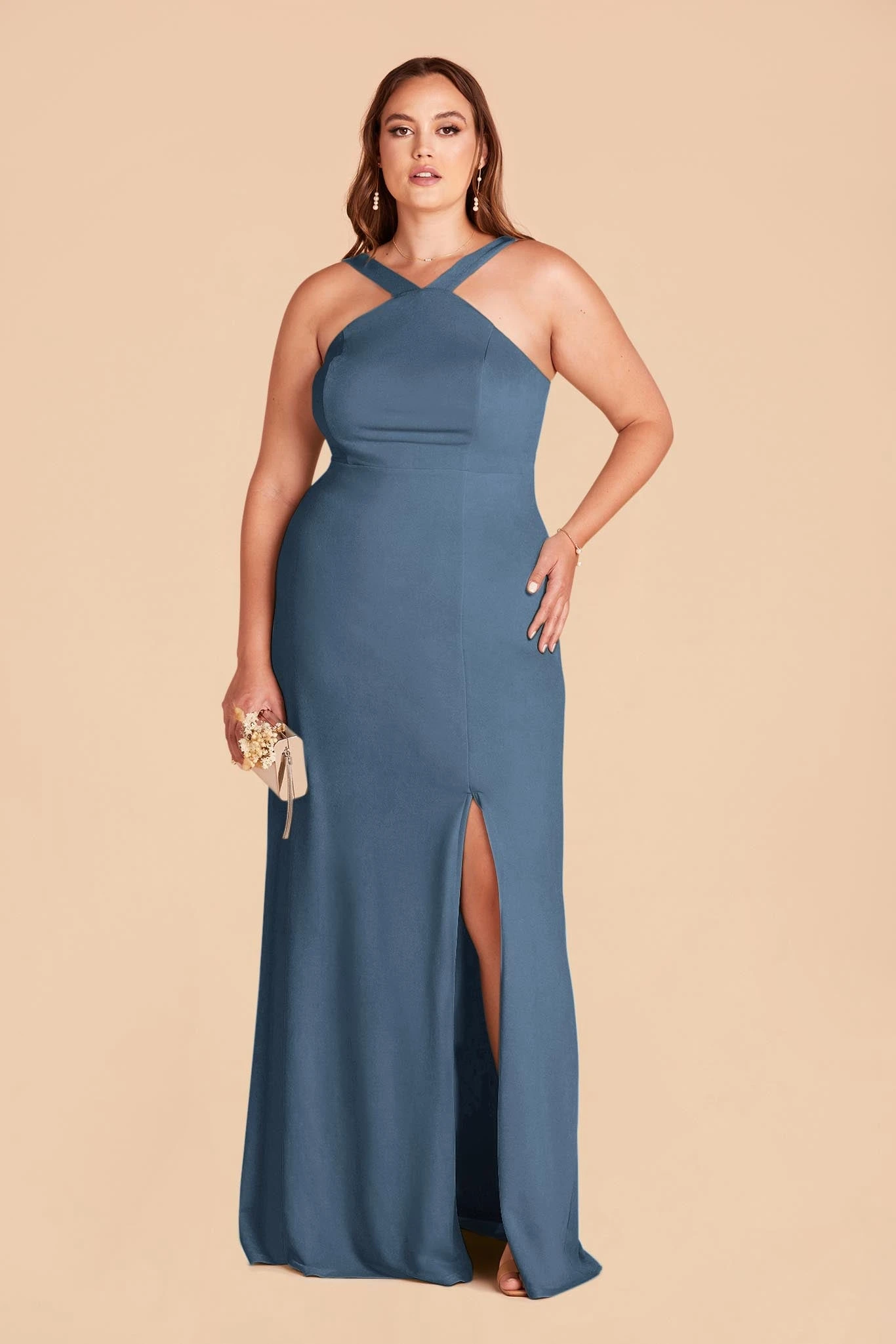 A fresh update on the halter look, the Gene crepe bridesmaid dress features an edgy criss-cross halter with flat, wide straps that highlight your shoulders and also brings a bit of the bodycon vibe on top (without it being overly sexy). She’s sleek, seductive, and definitely knows how to party. Pair her with a soft up-do to balance out the modern look while showing off the shoulders, or go for long, loose waves that add a touch of romance.