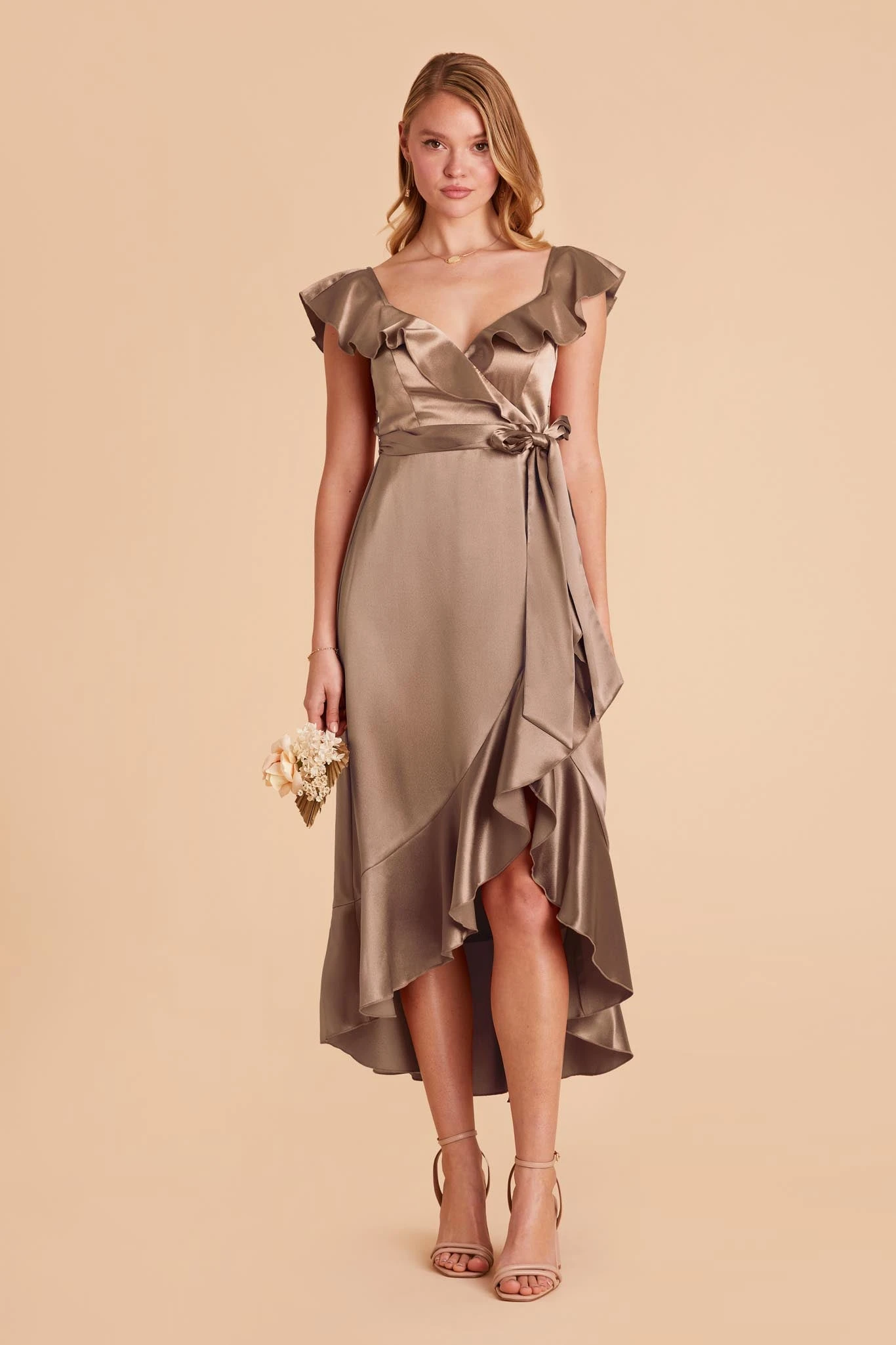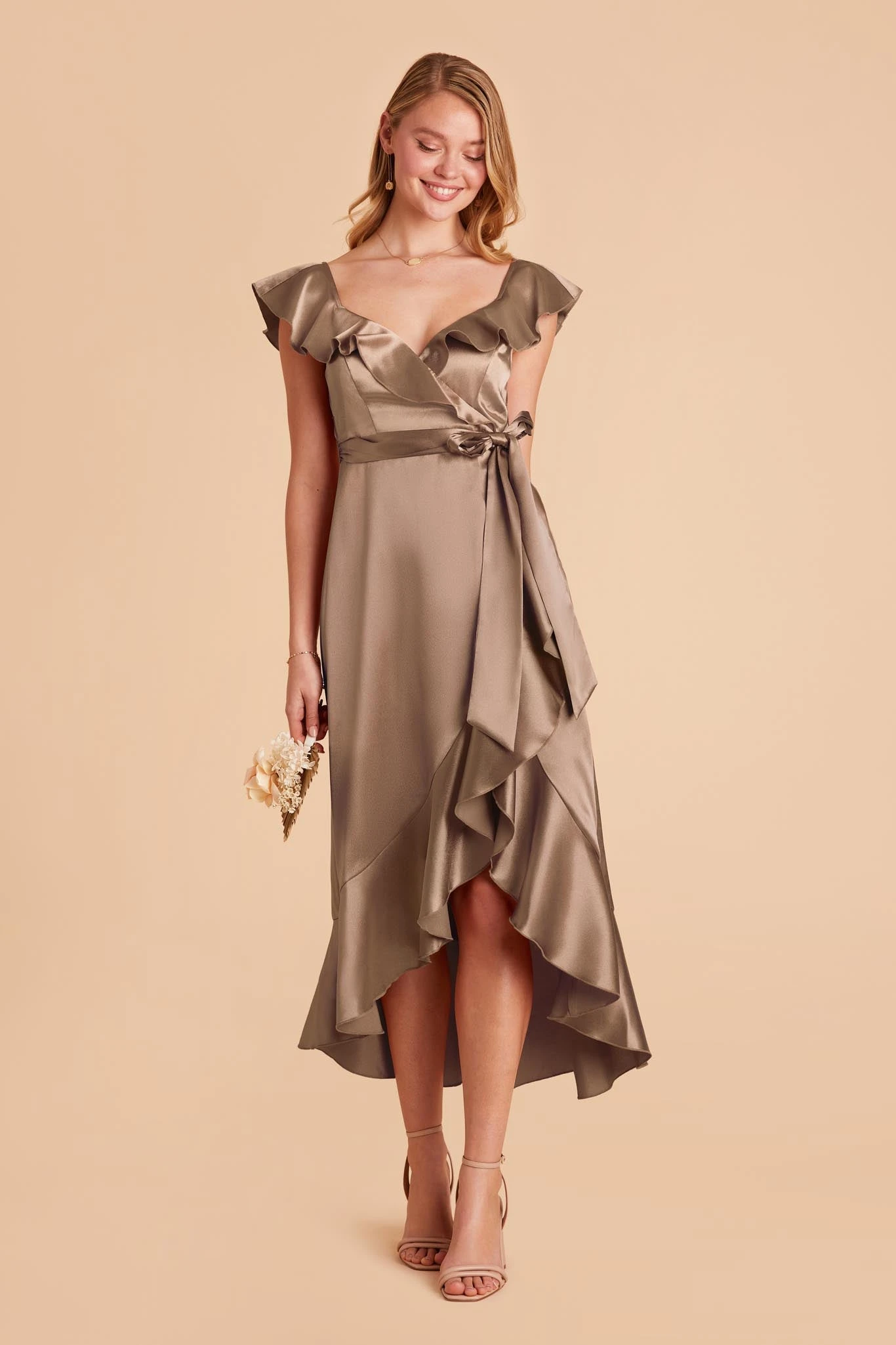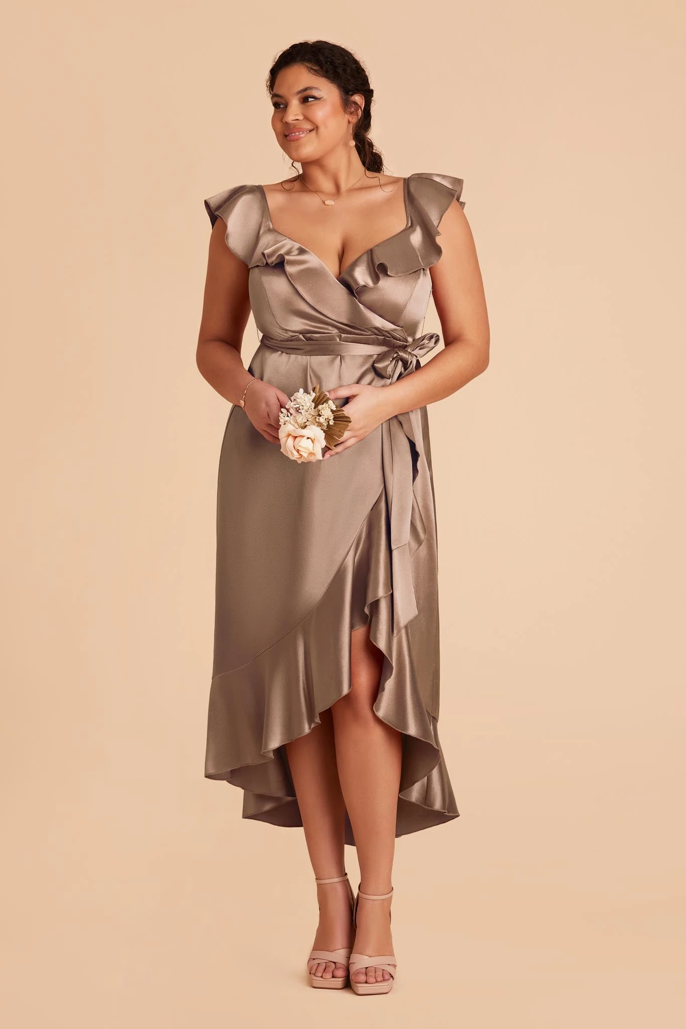 This satin midi bridesmaid dress, with its asymmetrical skirt and cascading ruffles is as romantic as it gets.