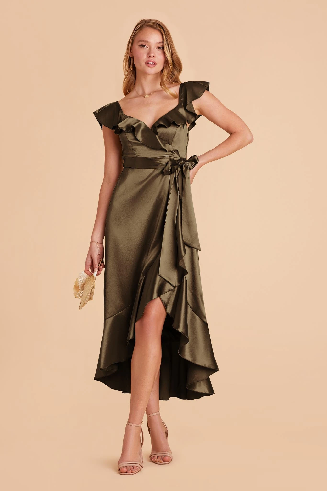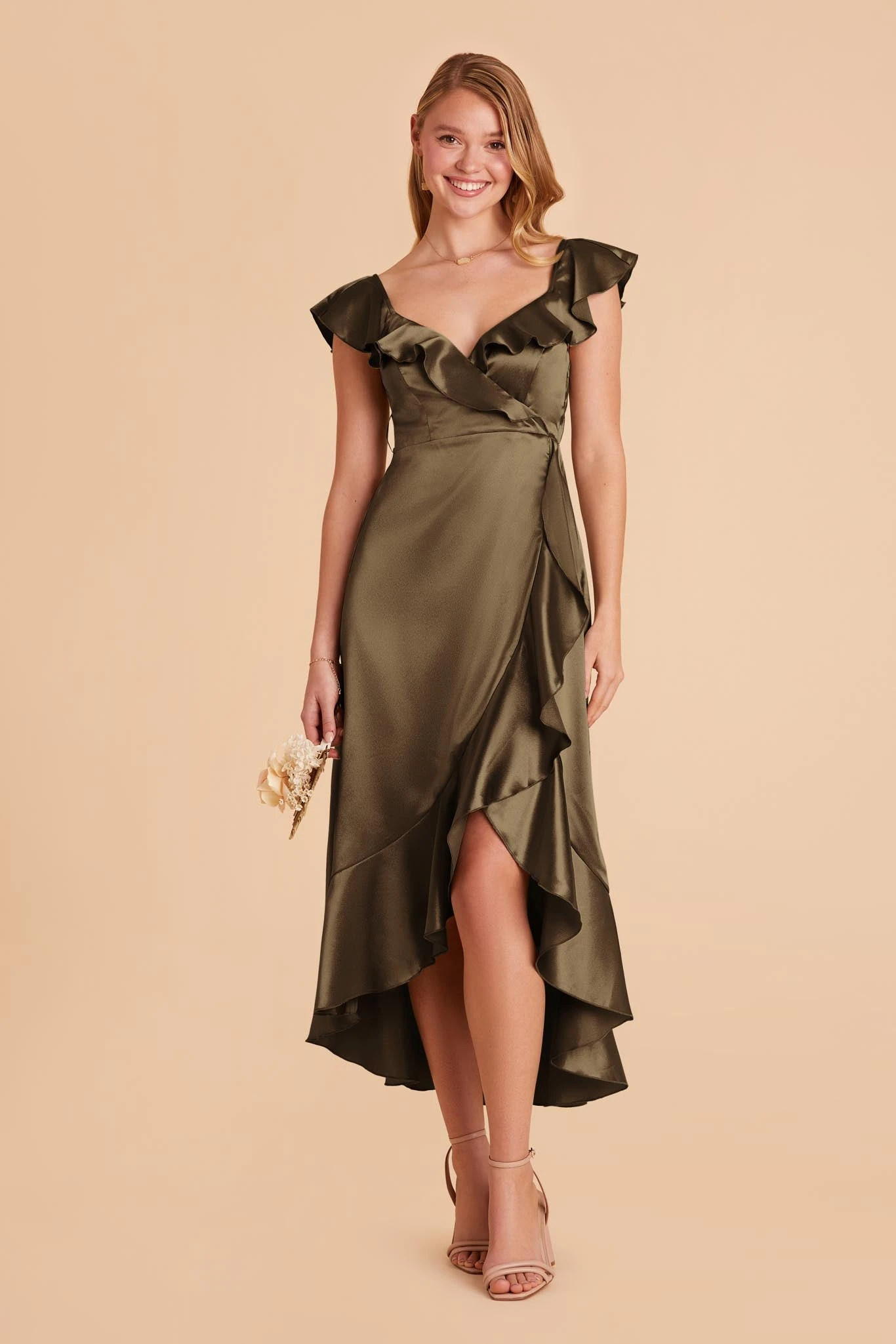 This satin midi bridesmaid dress, with its asymmetrical skirt and cascading ruffles is as romantic as it gets.