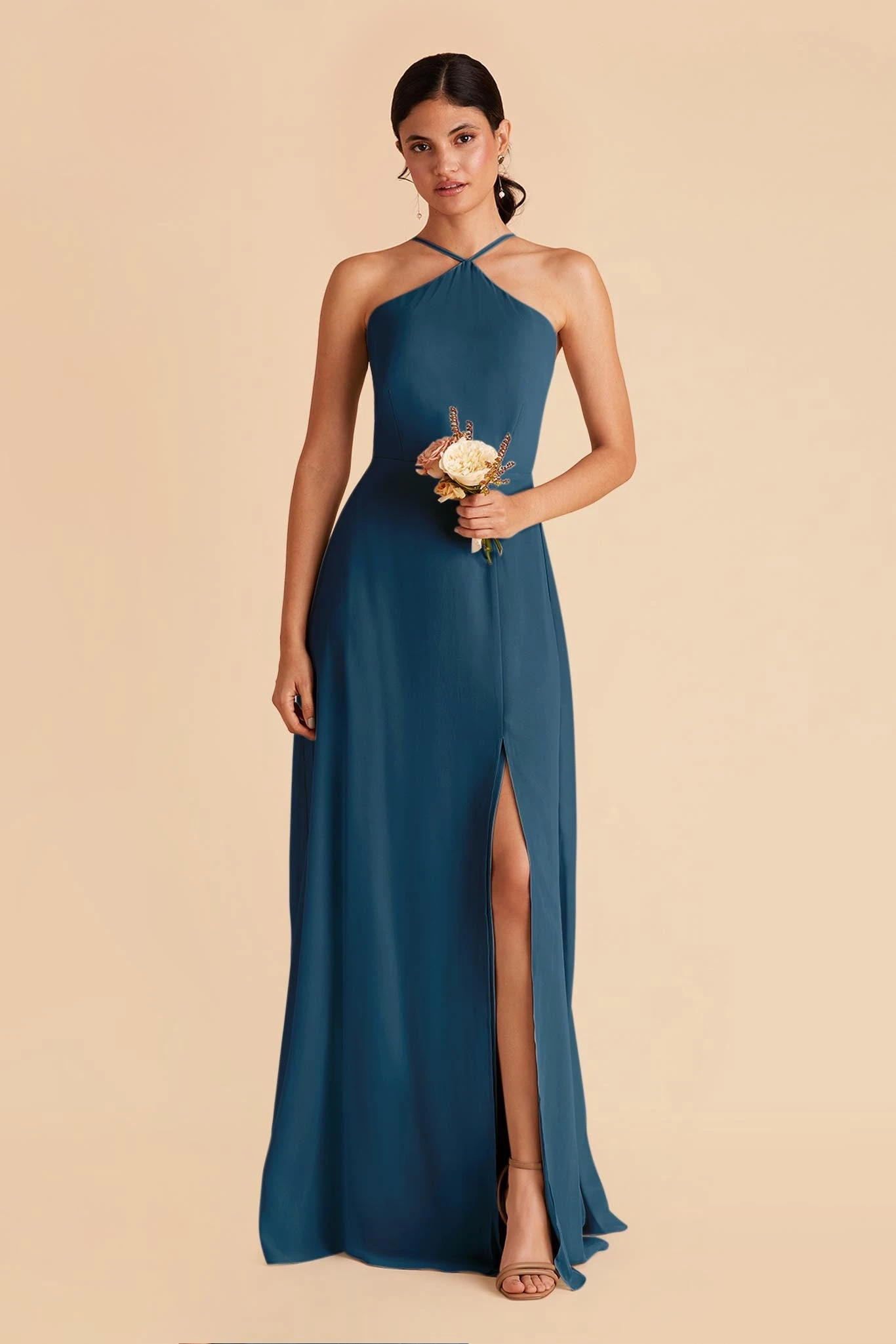 Less is more with this thin-strapped halter bridesmaid dress. Juliet also features a slimmer, more minimal skirt design, that dials up the sleek factor in a big way. She’s perfect for the bridesmaid who’s looking for a simpler design but still wants the elegance of chiffon.
