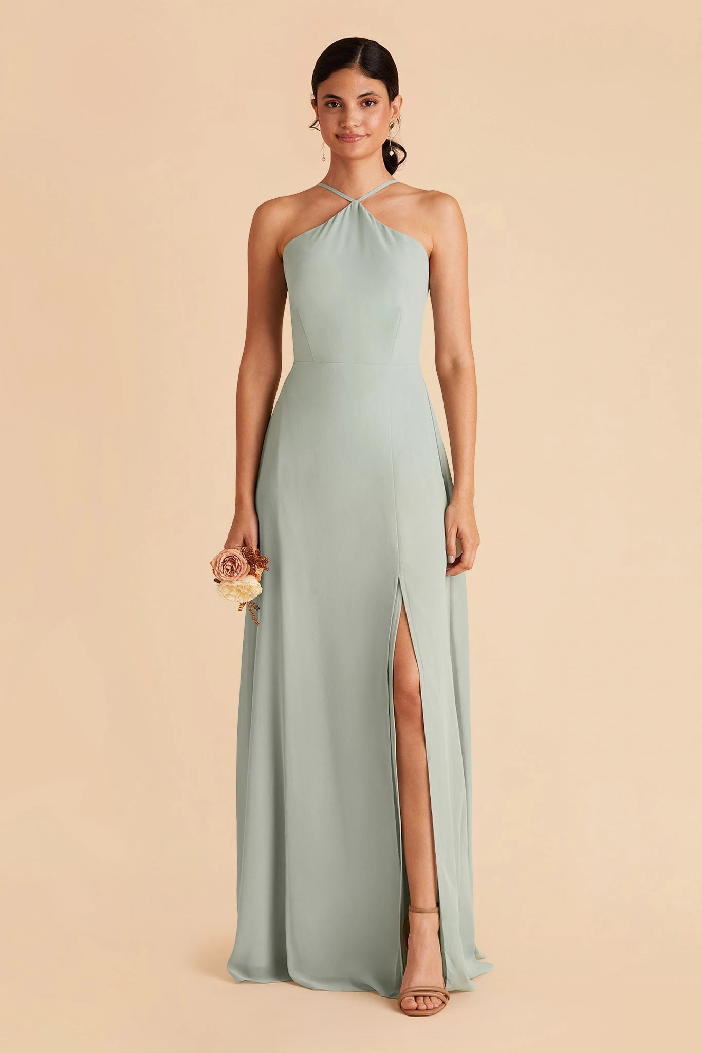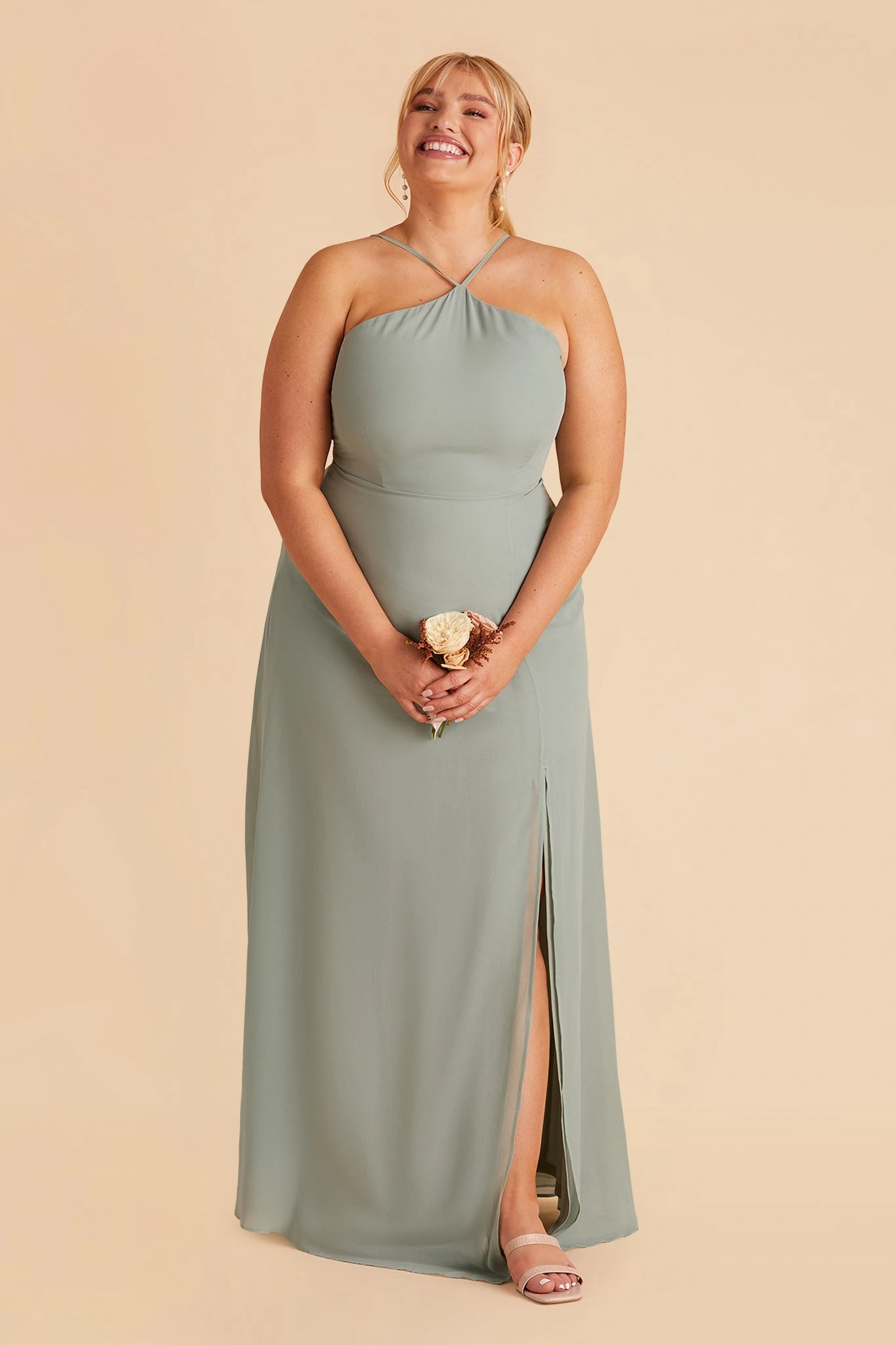 Less is more with this thin-strapped halter bridesmaid dress. Juliet also features a slimmer, more minimal skirt design, that dials up the sleek factor in a big way. She’s perfect for the bridesmaid who’s looking for a simpler design but still wants the elegance of chiffon.