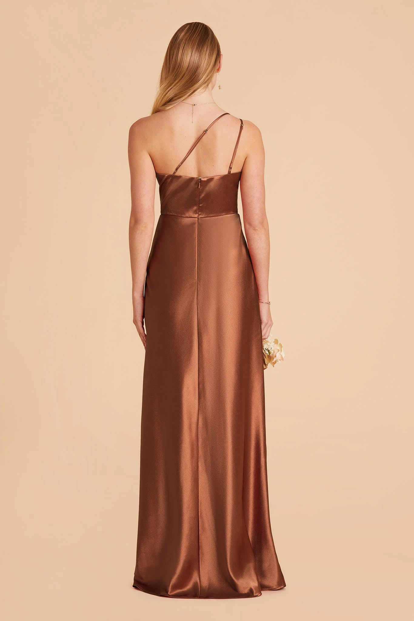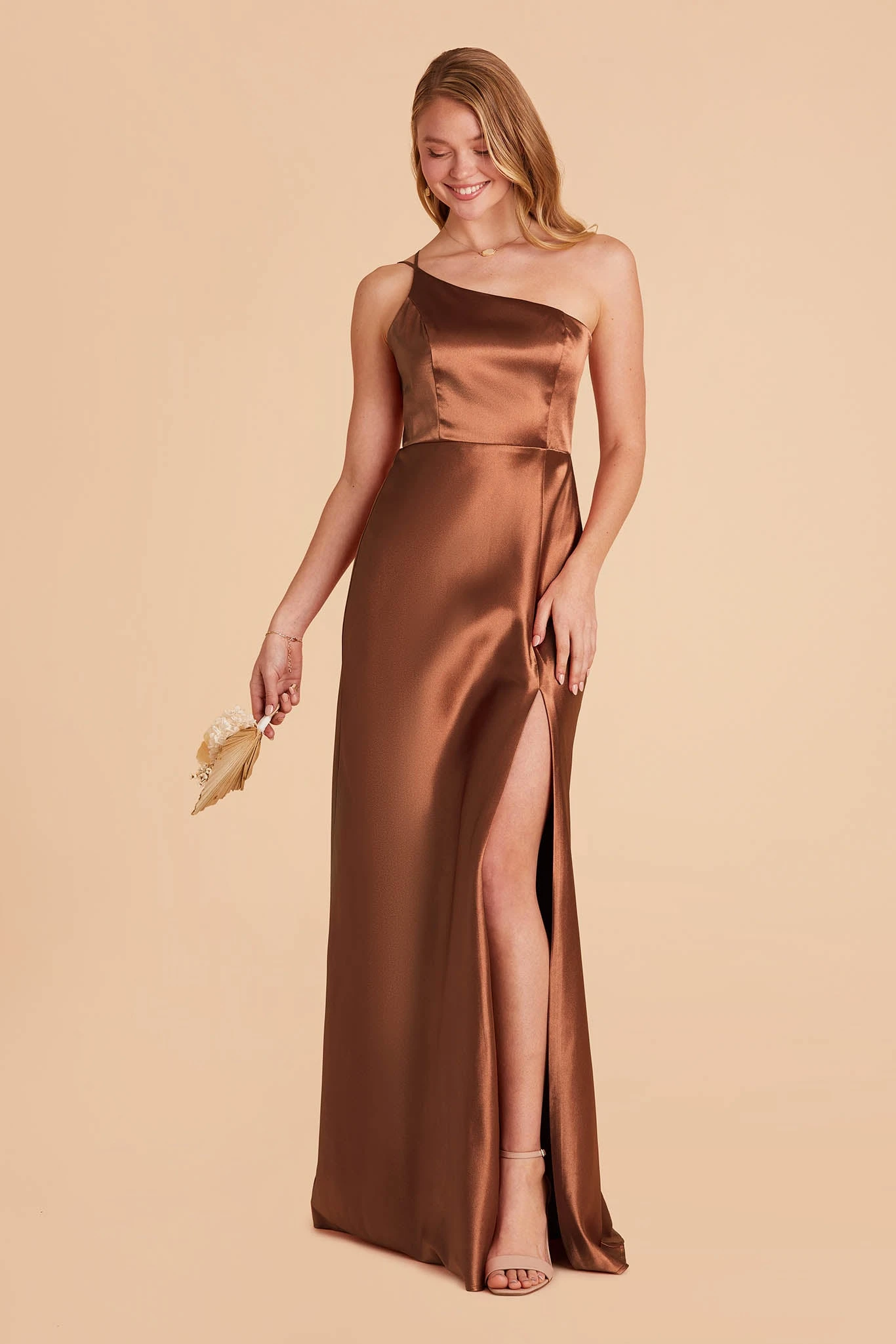 This ultra modern one-shoulder satin bridesmaid dress is the picture of 21st century elegance.