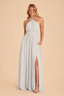 What does every goddess need in order to complete her sleek bridesmaid look? Secret side pockets for stashing her iPhone! This design features a gently ruched high-neck halter silhouette and a sexy slit in the skirt. Kiko in airy chiffon also has built-in bra cups and fits true-to-size.