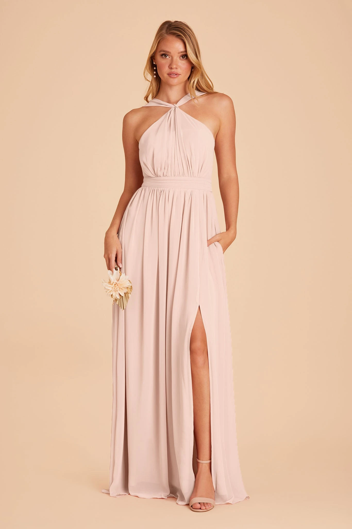 What does every goddess need in order to complete her sleek bridesmaid look? Secret side pockets for stashing her iPhone! This design features a gently ruched high-neck halter silhouette and a sexy slit in the skirt. Kiko in airy chiffon also has built-in bra cups and fits true-to-size.