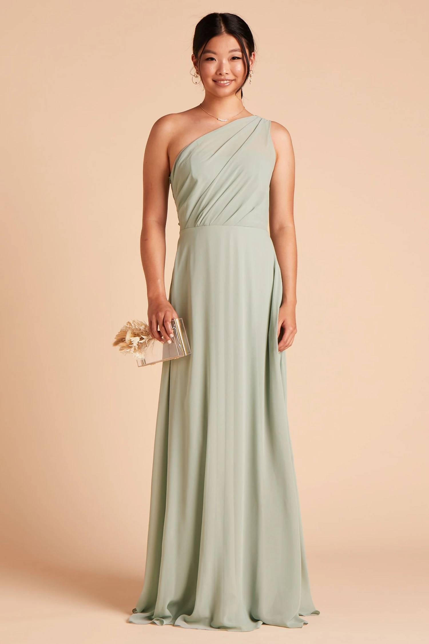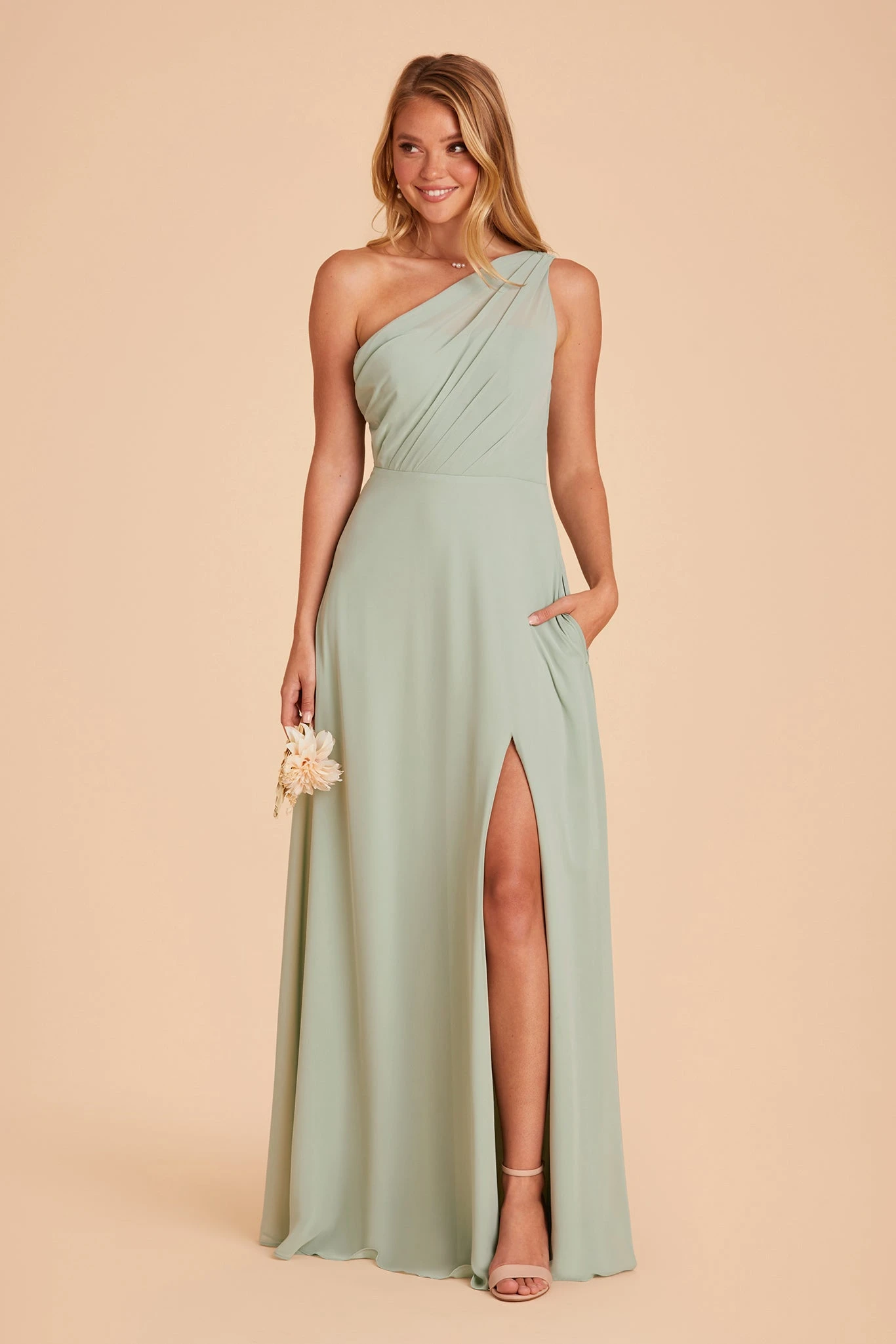Like you, our Kira bridesmaid dress embodies classic beauty (*kiss*). This flowing chiffon bridesmaid dress is a style staple and no-brainer, if you’re looking to feel like a statuesque Greek goddess. The lightly pulled one shoulder and softly draped back are at once simple and regal, so you can float down the aisle in all your Aphrodite vibes. This dress features built-in bra cups, a flowing skirt, and a hidden side pocket, so you can be prepared with a detergent pen or a safety pin or a disposable camera to capture a precious moment.