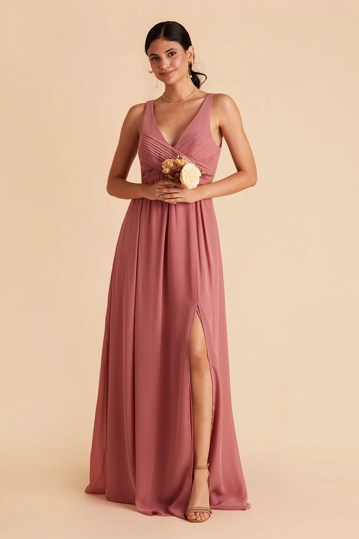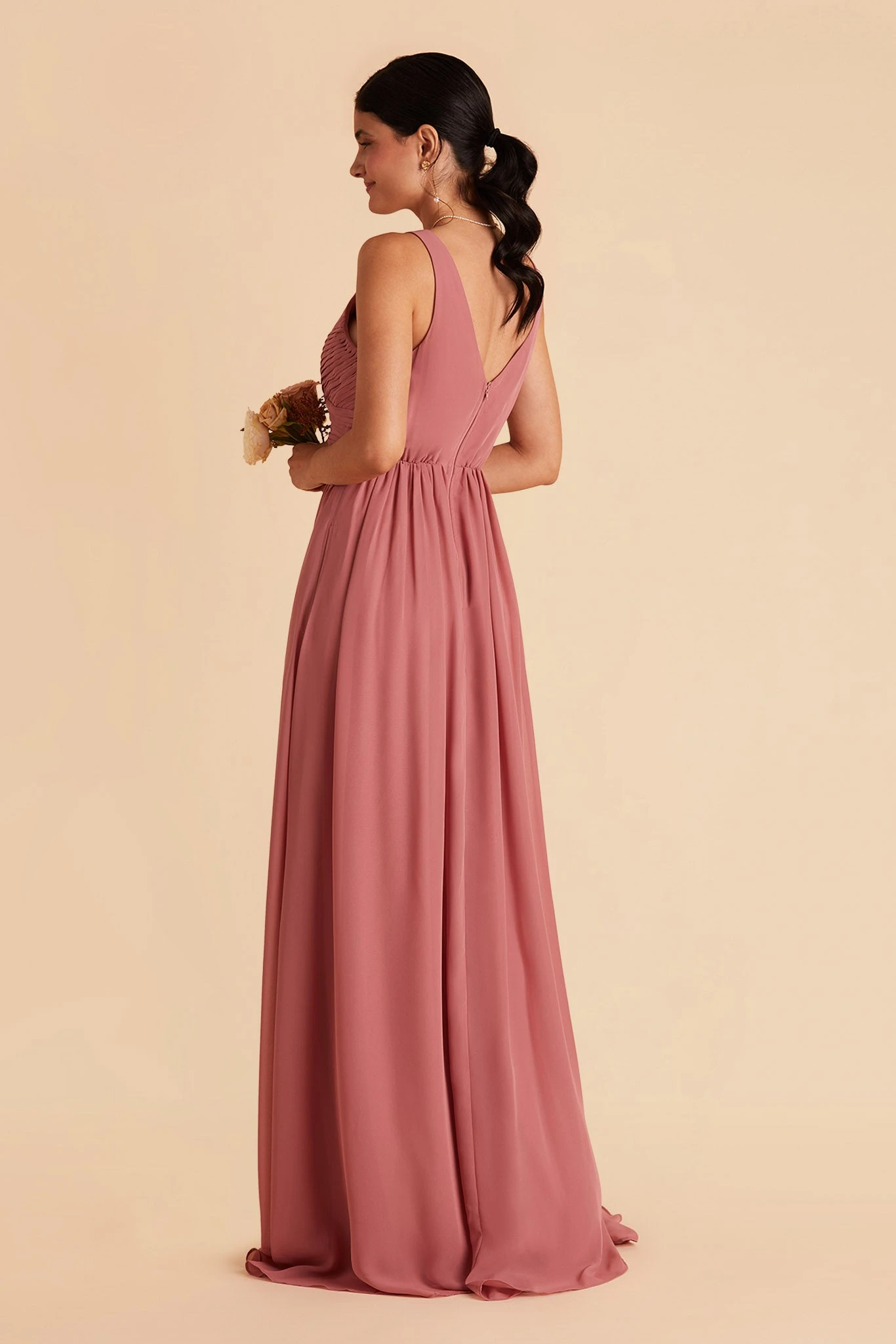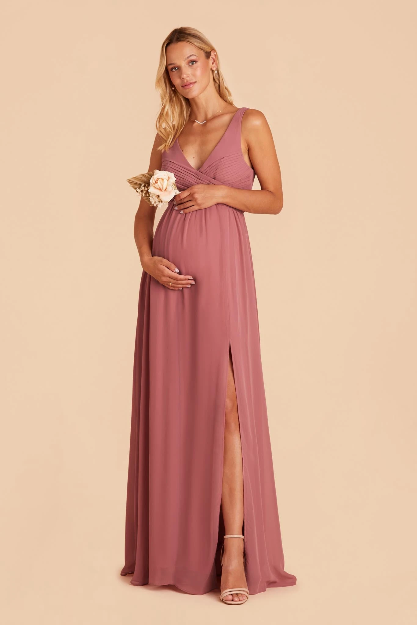 Pretty ✔ Classy ✔ Comfy ✔ This floor-length sleeveless chiffon bridesmaid dress has a raised empire waist which means it’s not only perfect for someone who wants some extra breathing room (while looking long & lean), it also doubles as a maternity bridesmaid dress for expecting moms with a growing baby bump. The bodice features beautiful pleating and because everyone can use a little bit of sex appeal while keeping things classy, we also added a slit for a flash of leg.