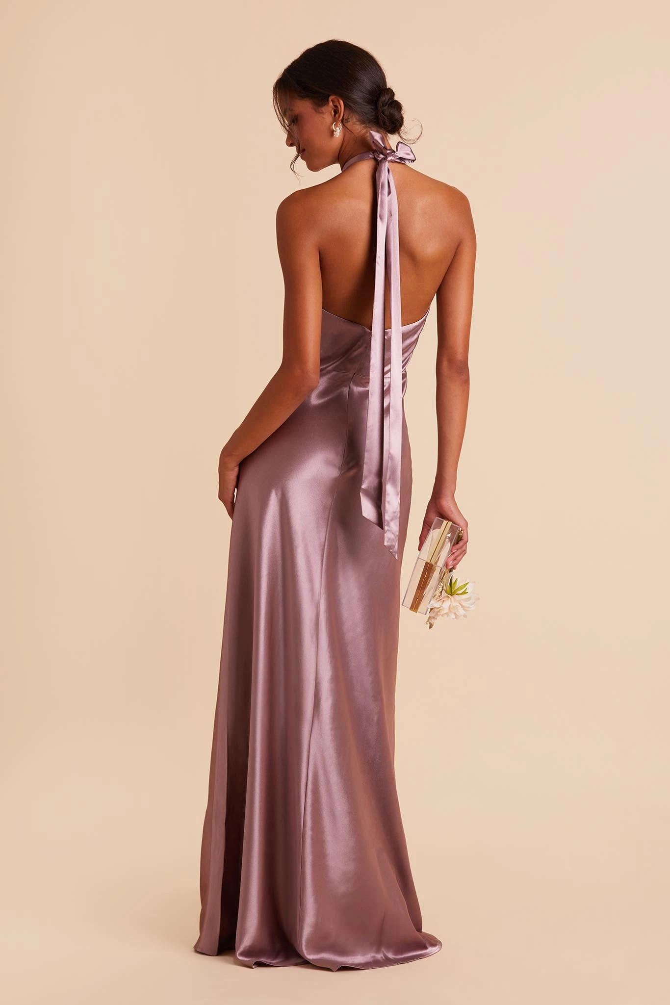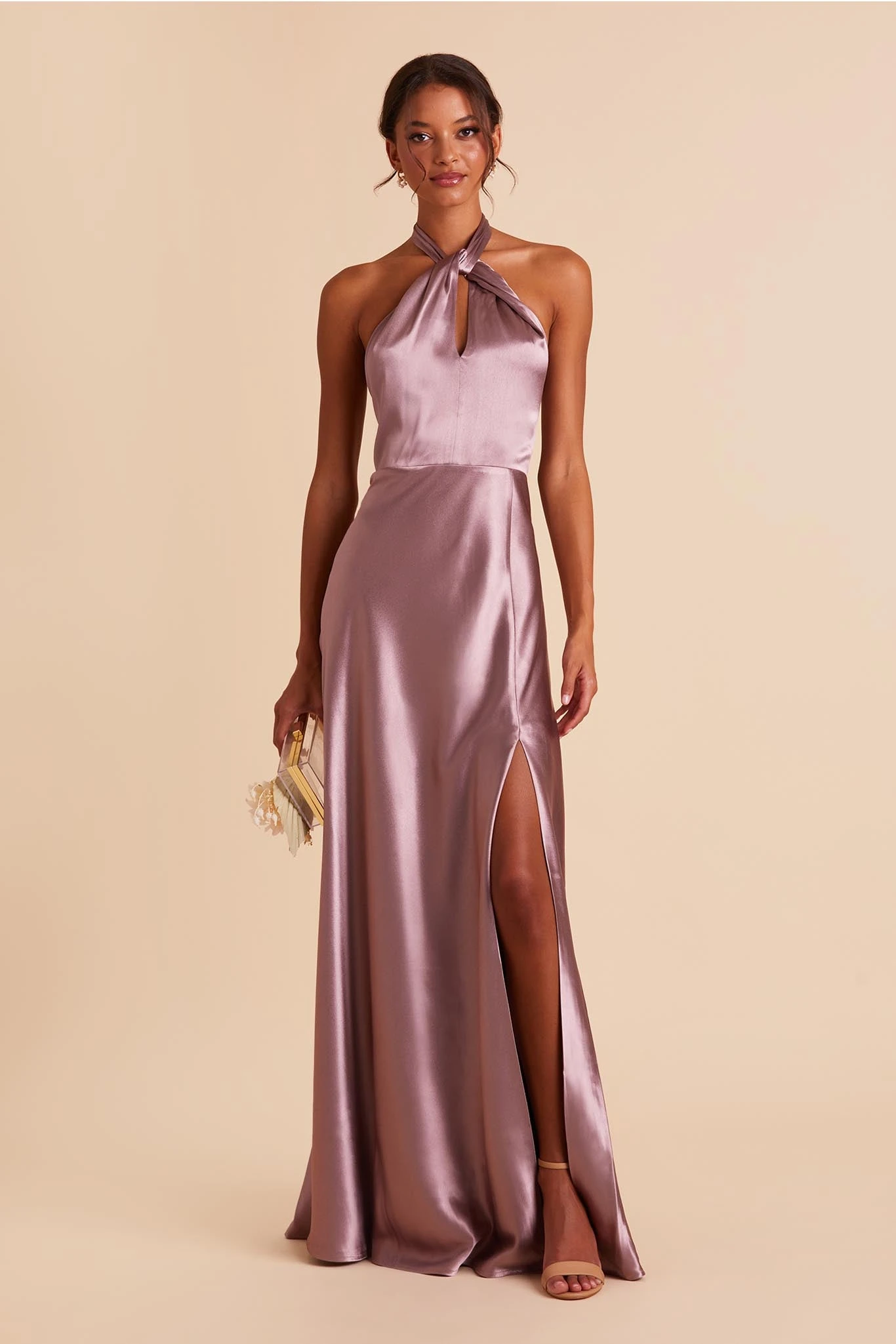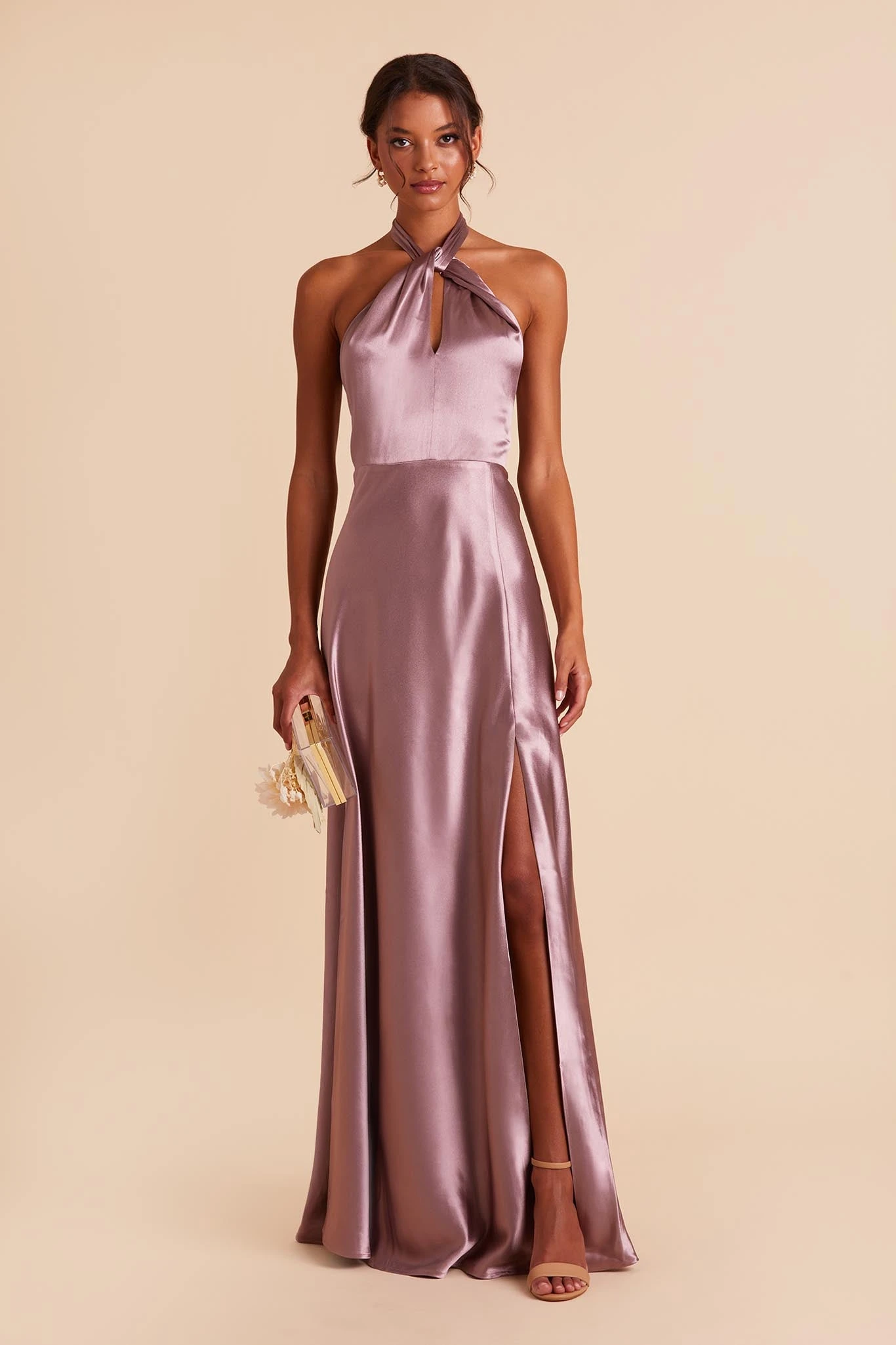Your wedding will look like a star-studded event with your bridal party wearing this twist-front halter satin bridesmaid dress. The lustrous fabric of this floor-length gown makes each color look rich and regal while the halter style creates an alluring look that’s on par with an A-list Hollywood star. We love this bridesmaid dress paired with a low bun that softens the cool, modern style while showing off the neckline.