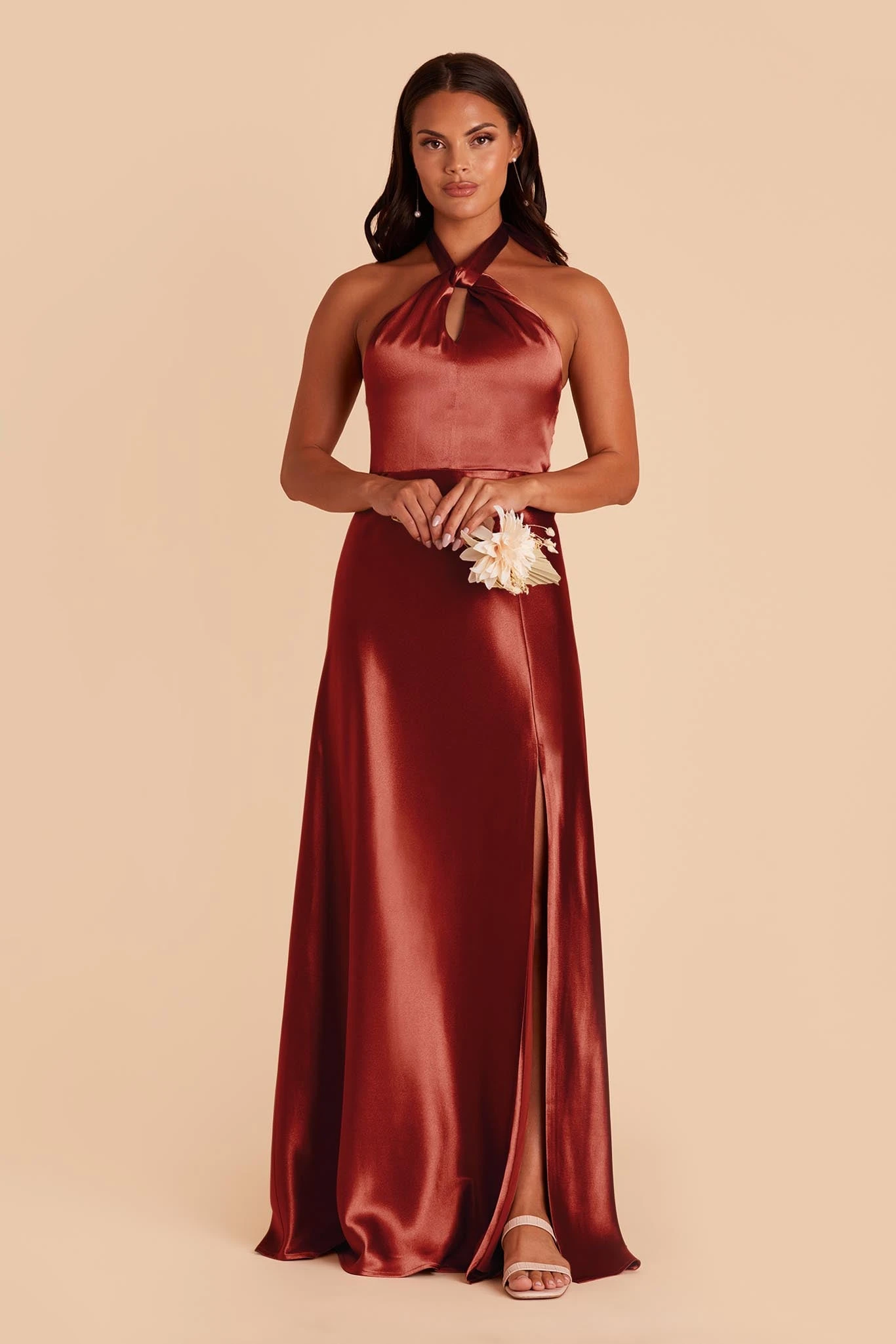 Your wedding will look like a star-studded event with your bridal party wearing this twist-front halter satin bridesmaid dress. The lustrous fabric of this floor-length gown makes each color look rich and regal while the halter style creates an alluring look that’s on par with an A-list Hollywood star. We love this bridesmaid dress paired with a low bun that softens the cool, modern style while showing off the neckline.
