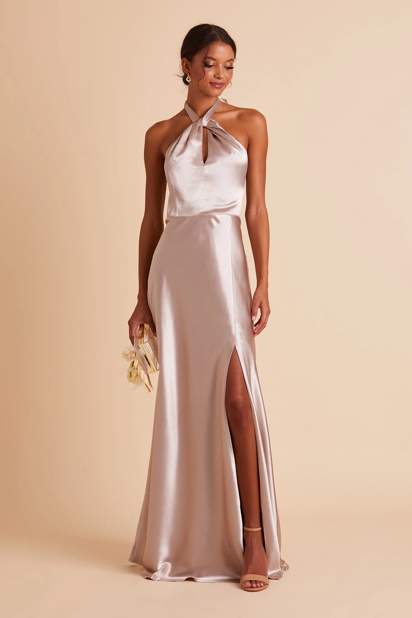 Your wedding will look like a star-studded event with your bridal party wearing this twist-front halter satin bridesmaid dress. The lustrous fabric of this floor-length gown makes each color look rich and regal while the halter style creates an alluring look that’s on par with an A-list Hollywood star. We love this bridesmaid dress paired with a low bun that softens the cool, modern style while showing off the neckline.