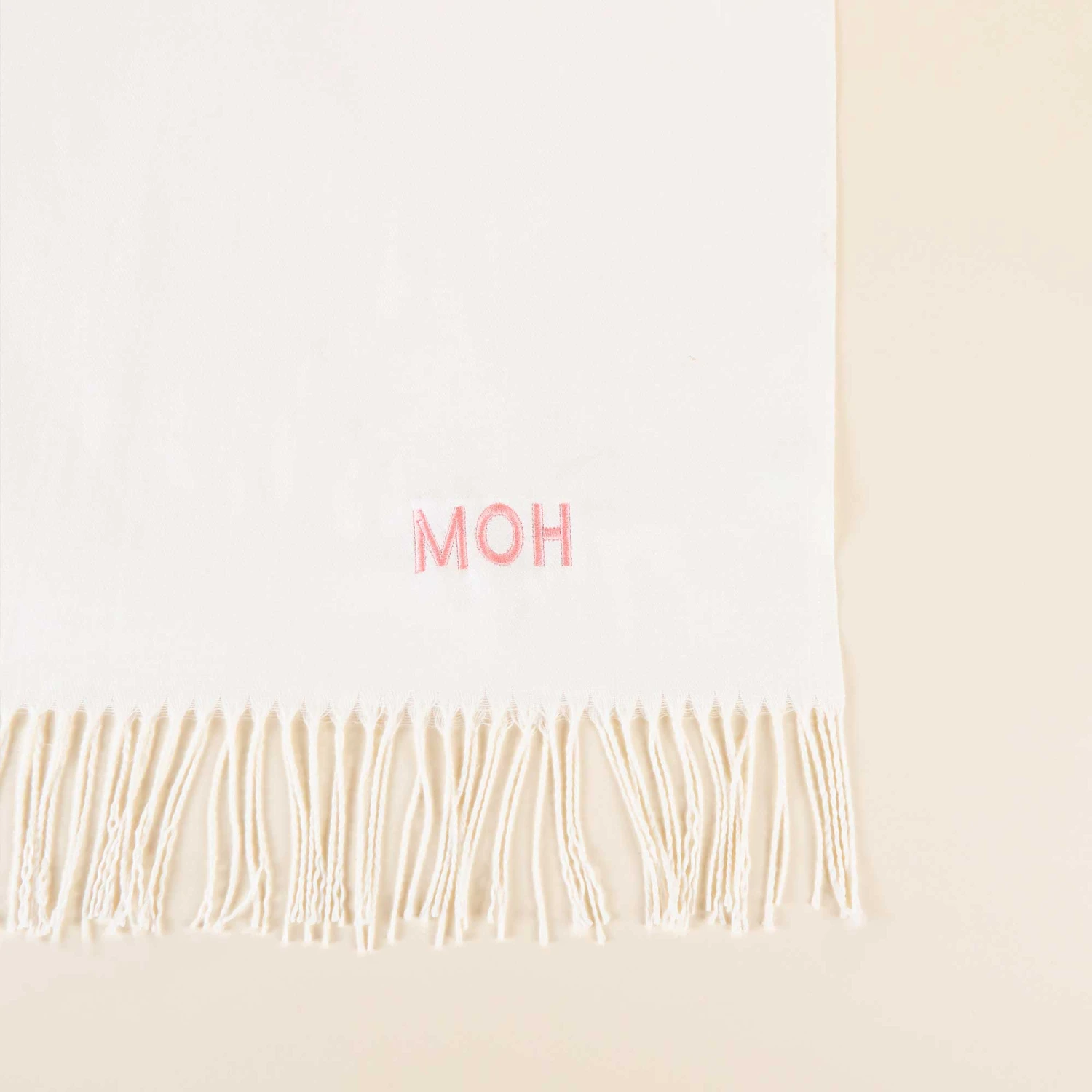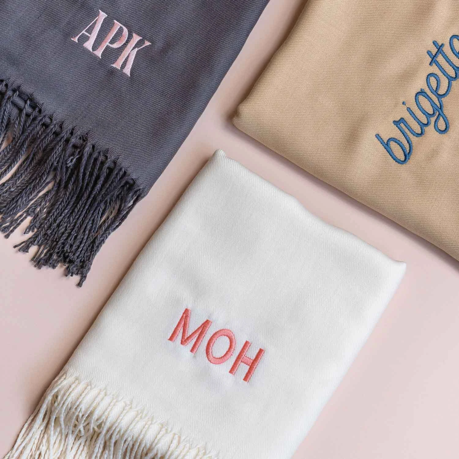 Please note, the live preview of the personalization appears on a folded shawl. The embroidery is aligned on the right side of the garment, not in the center.