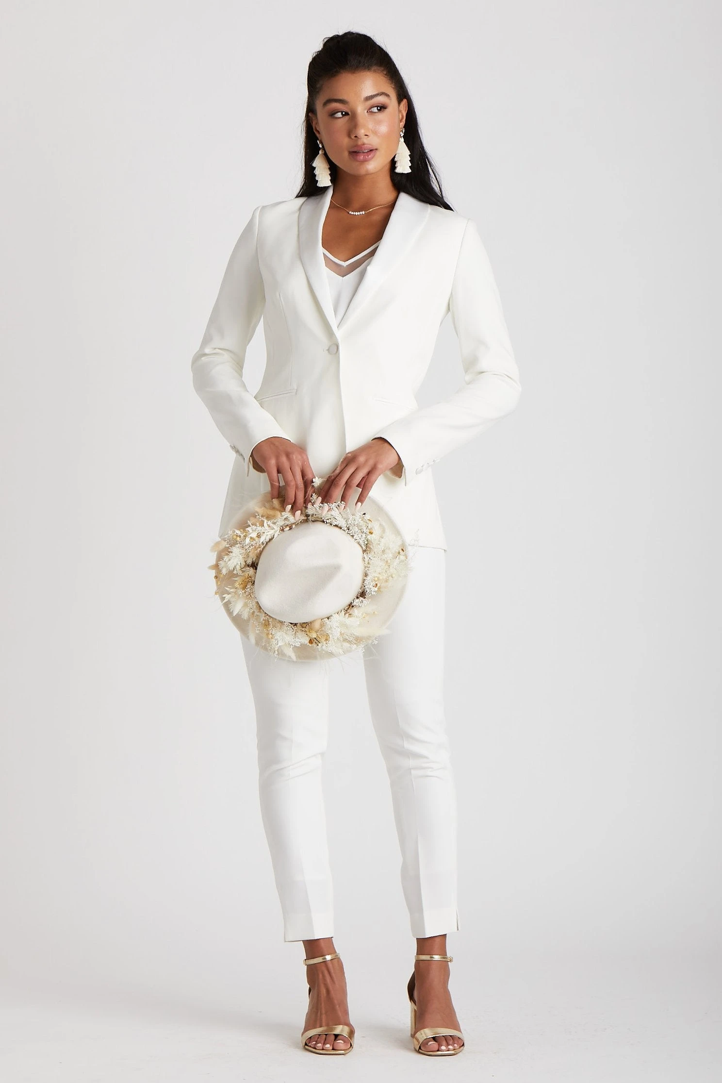Look sharp with this classic white woman’s tuxedo by SuitShop. It features a beautifully tailored tuxedo jacket and tapered pants with a touch of stretch to make a statement on your wedding day… or in place of an LWD at the rehearsal dinner, bachelorette or any other bridal festivities.